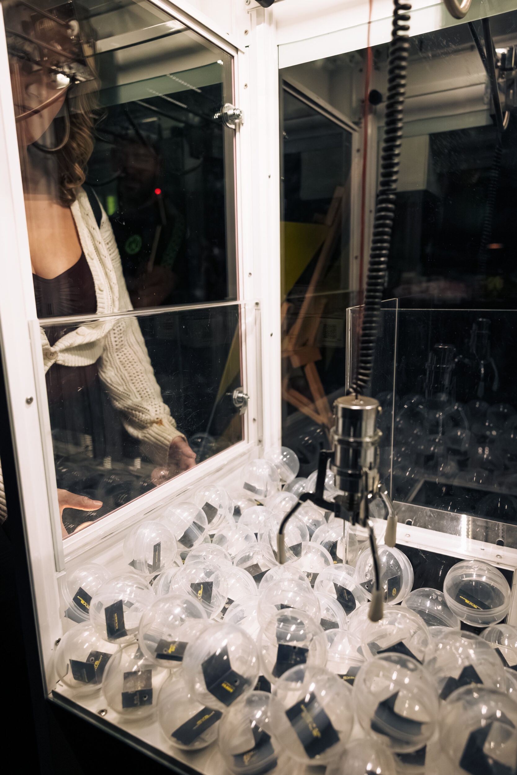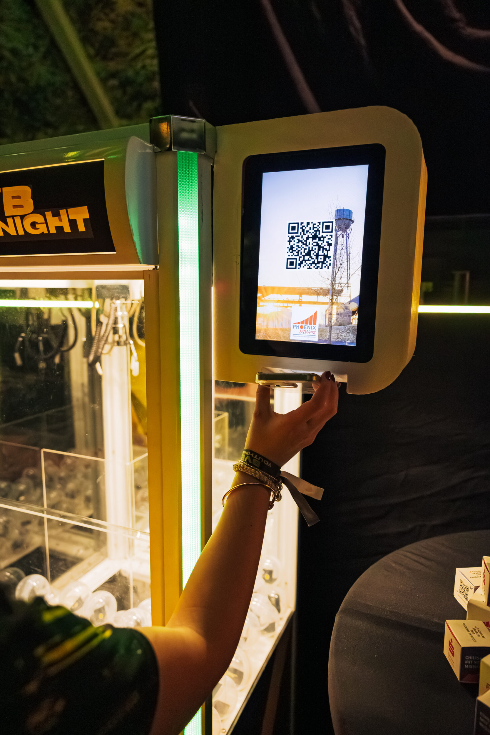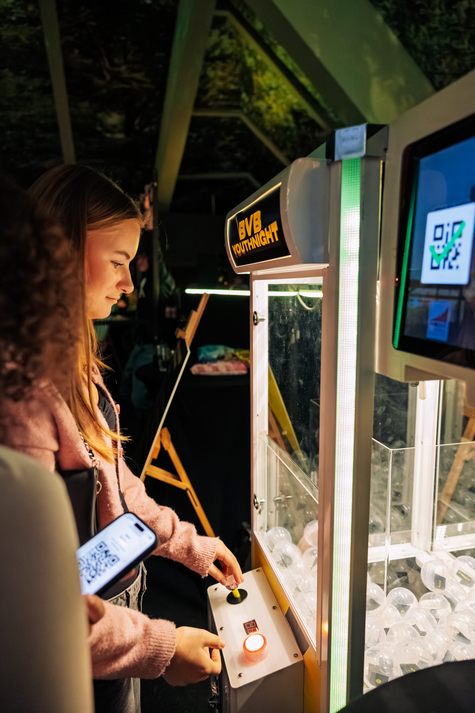 Ein zentraler Bestandteil des BVB YouthNight Event war der gebrandete Greifarm. Farben, Flächen und Kapseln waren klar auf Borussia Dortmund abgestimmt, sodass sich das Tool nahtlos in die Markenwelt einfügte. Zusätzlich kam ein Touchmonitor zum Einsatz, über den die Gäste ihre Mailadresse eingeben konnten. So entstand eine direkte Lead-Generierung für die Sparkasse Dortmund, während die Aktion gleichzeitig spielerisch blieb. Drei Promoter begleiteten die Nutzung, erklärten den Ablauf und sorgten dafür, dass alles reibungslos funktionierte.