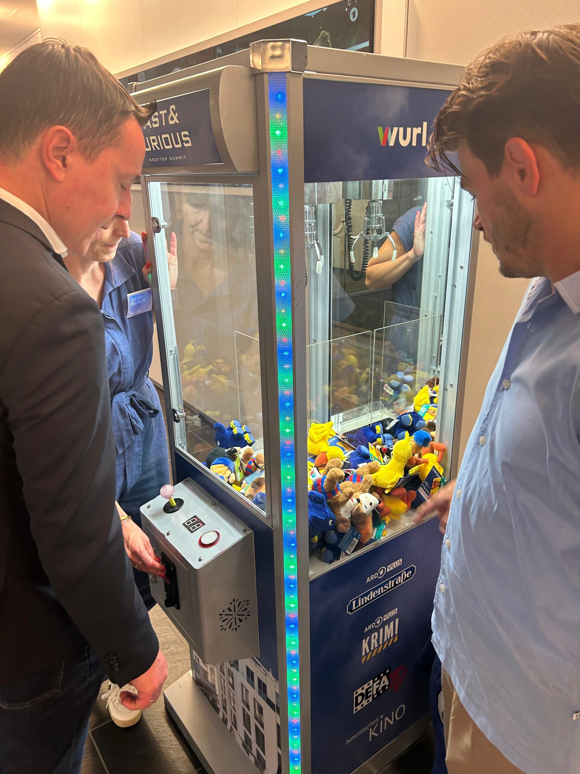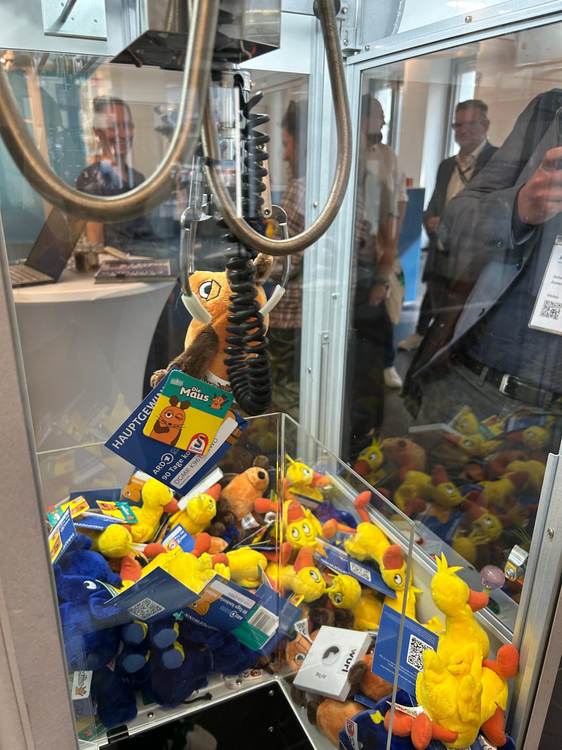 Die Coins wurden vorab an alle Gäste verteilt, sodass jeder mindestens einen Versuch hatte. Das sorgte für entspannte Stimmung und faire Chancen für alle Teilnehmenden. Der Greifarmautomat für WDR mediagroup war vollständig im Design des Unternehmens gestaltet und zog bereits durch seine Optik viele neugierige Blicke auf sich.