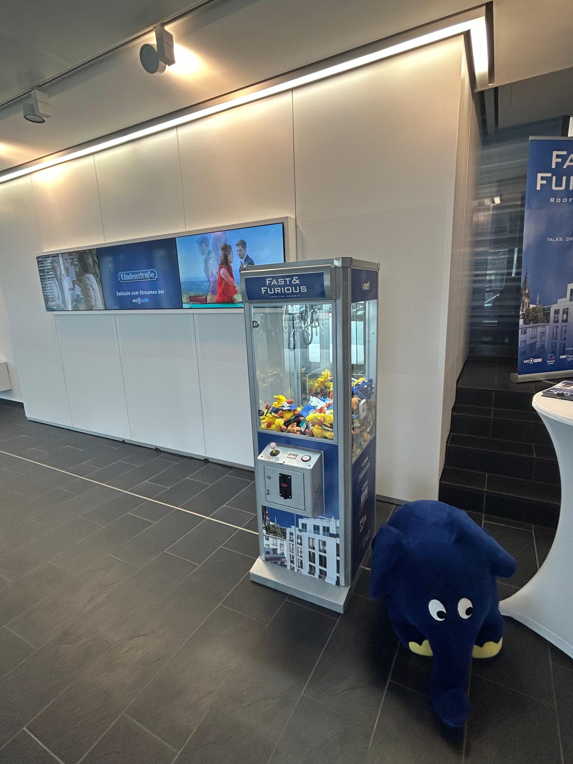 Beim Side-Event zur ANGA, direkt am WDR-Standort in Köln, sorgte ein individuell gebrandeter Greifarmautomat für WDR mediagroup für Unterhaltung und Aufmerksamkeit. Highlight des Events: Die Gäste konnten mit vorab verteilten Coins auf die bekannten Figuren aus der „Sendung mit der Maus“ losgreifen – Ente, Elefant und Maus.