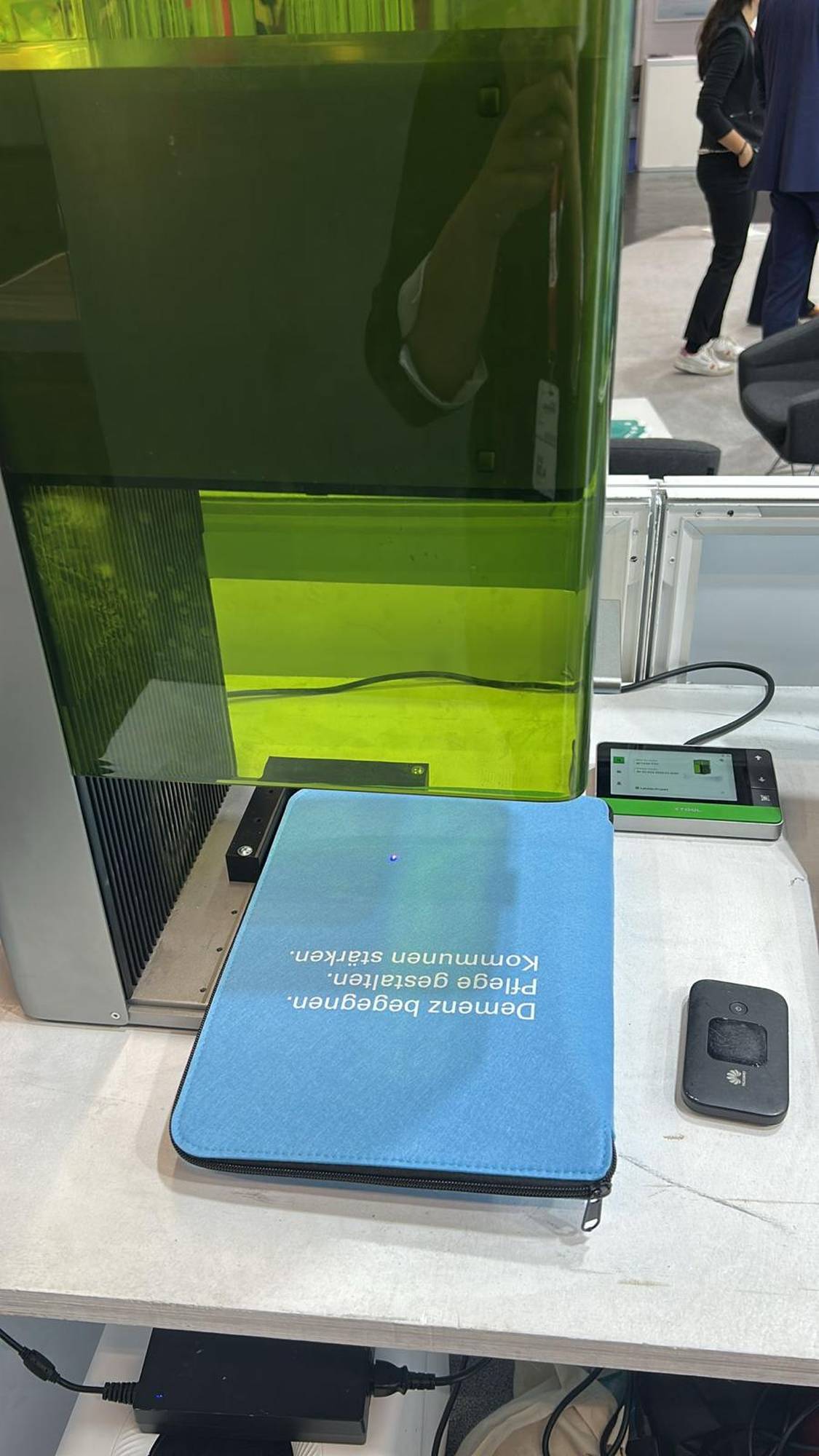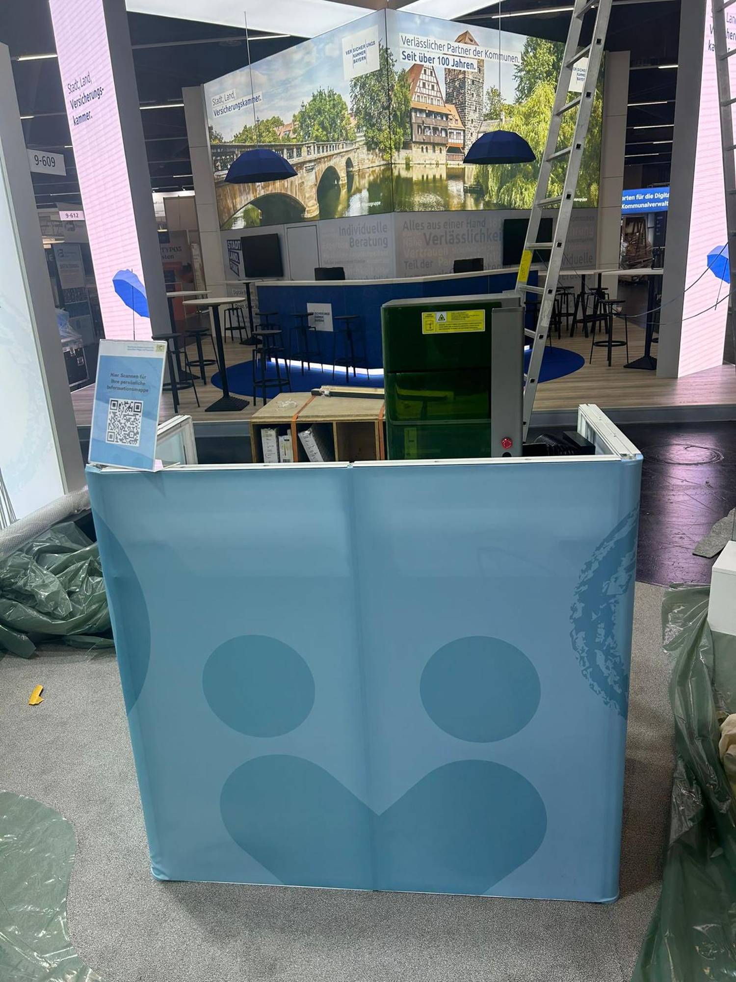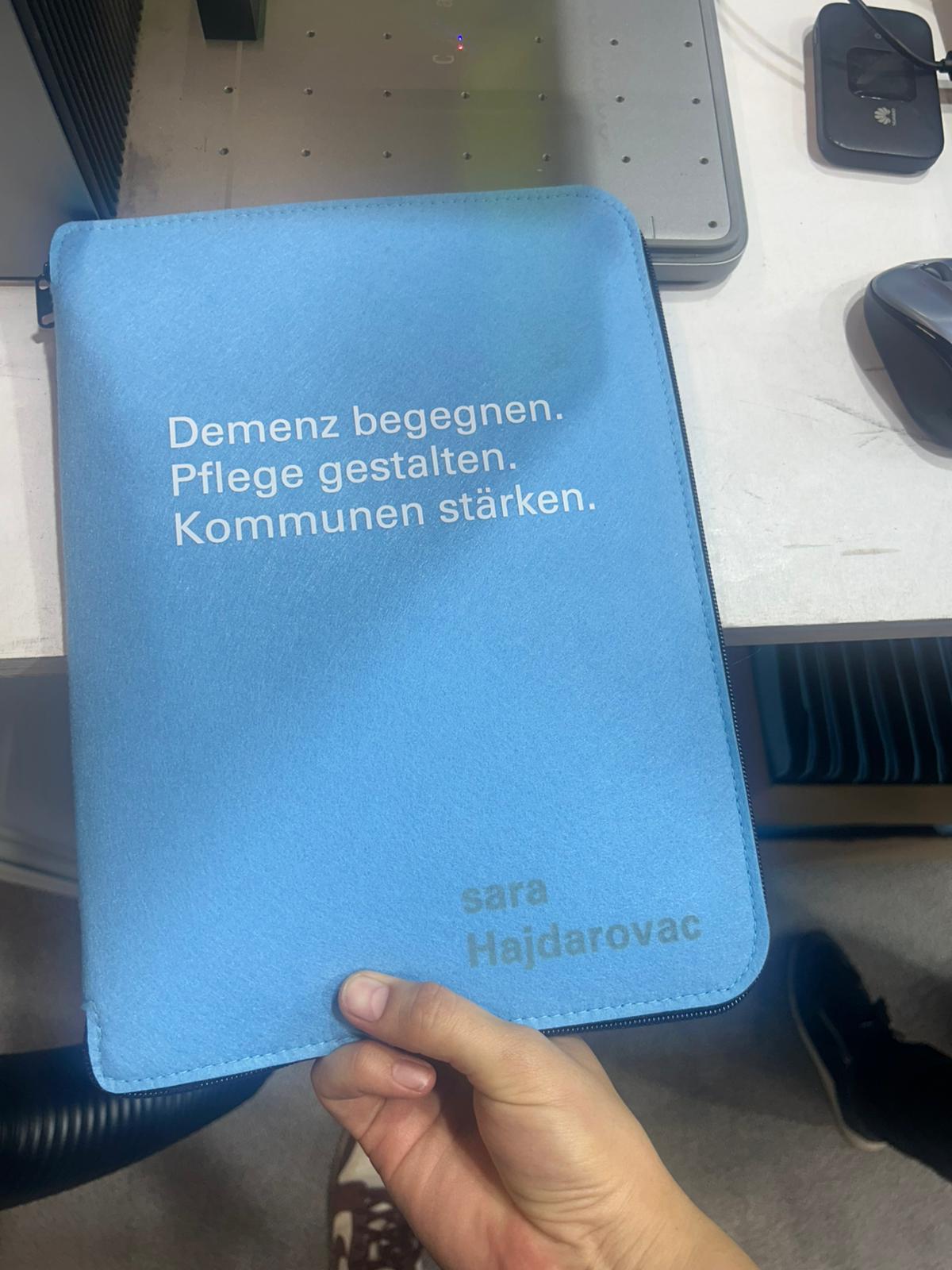Die Lasergravur Messeaktion überzeugte durch ihre Präzision und die sichtbare Wertigkeit der Produkte. Die gravierten Filzmappen eigneten sich ideal für den Einsatz im beruflichen Alltag und transportierten die Botschaft des Ministeriums über den Messetag hinaus. Ergänzt wurde die Aktion durch eine individuell gestaltete Theke mit passendem Stoff, die sich stimmig in den Gesamtauftritt einfügte.