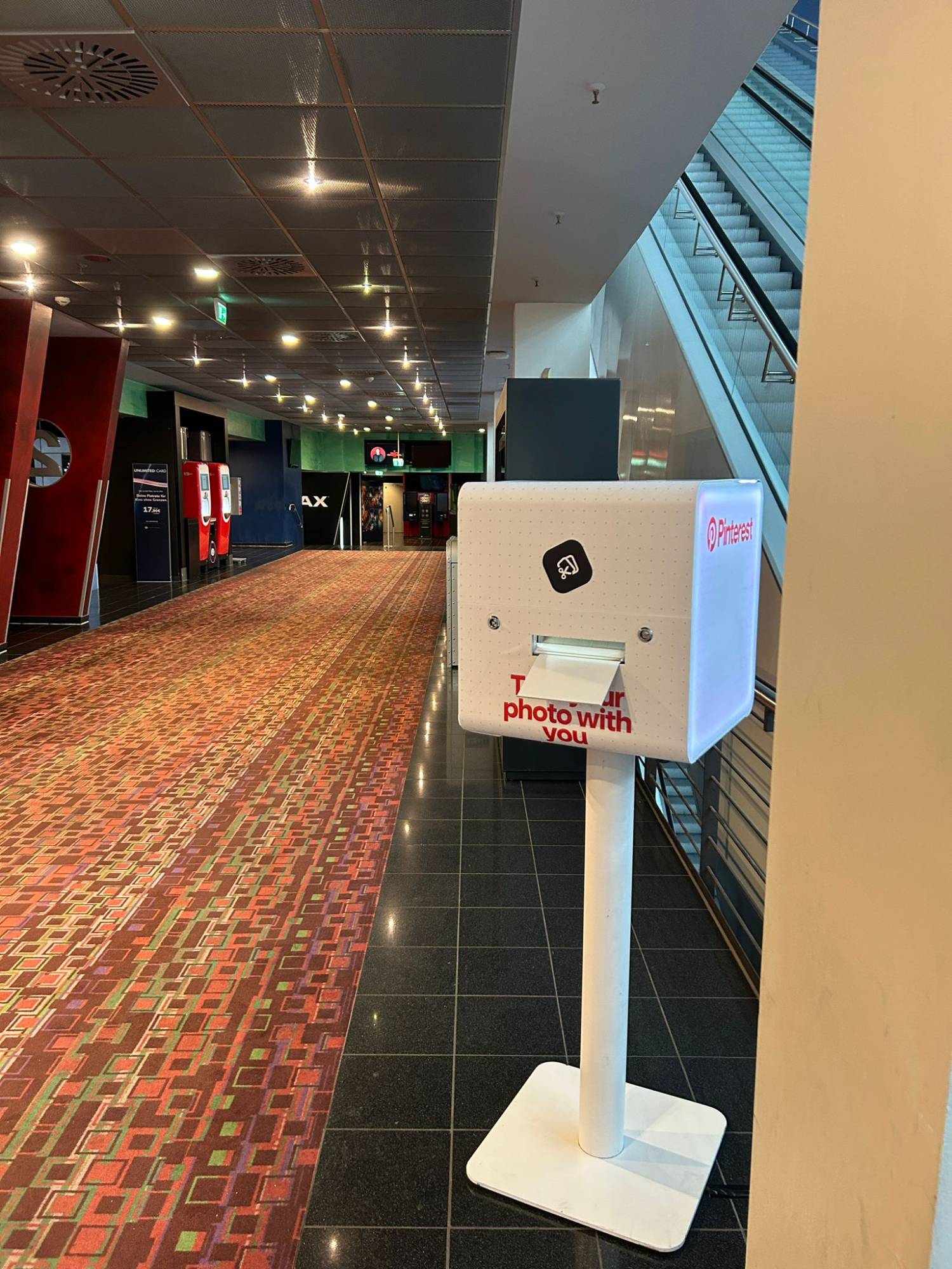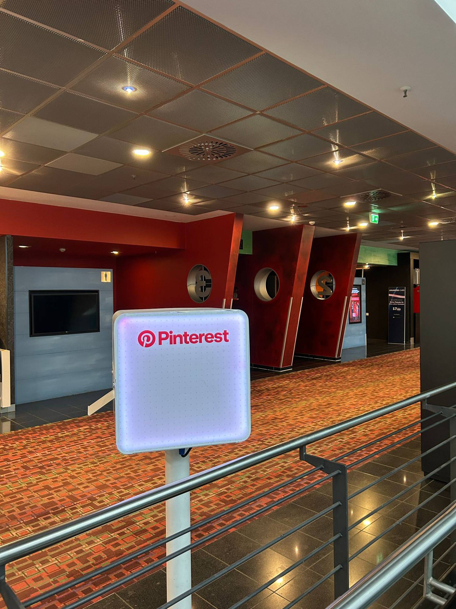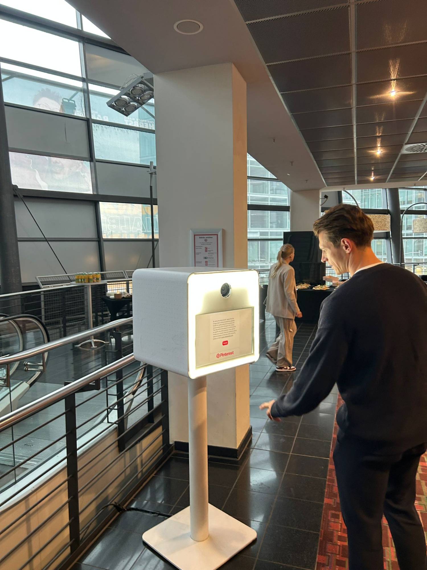 Die eingesetzte Photobooth war vollständig auf Pinterest abgestimmt. Das Screendesign griff Farben, Bildsprache und Stil der Marke auf, sodass sich die Gäste sofort in der bekannten Pinterest-Welt wiederfanden. Auch das Gehäuse wurde gebrandet, wodurch die Fotostation bereits aus der Distanz klar als Teil der Markeninszenierung erkennbar war.