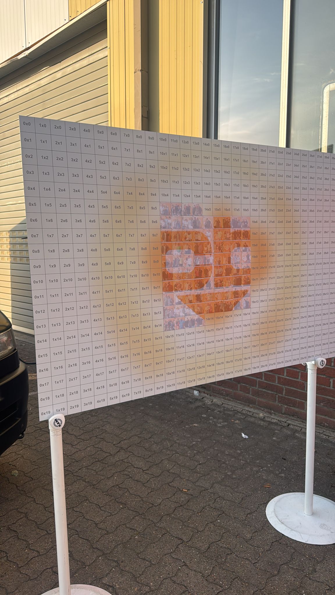 Neben den Fotoausdrucken entstand parallel ein analoges Fotomosaik. Aus 600 einzelnen Stickern wurde nach und nach eine große Fläche (ca. 200 x 100 cm) gefüllt. Die Gäste brachten sich aktiv ein und klebten ihr eigenes Bild auf die entsprechende Stelle im Raster.