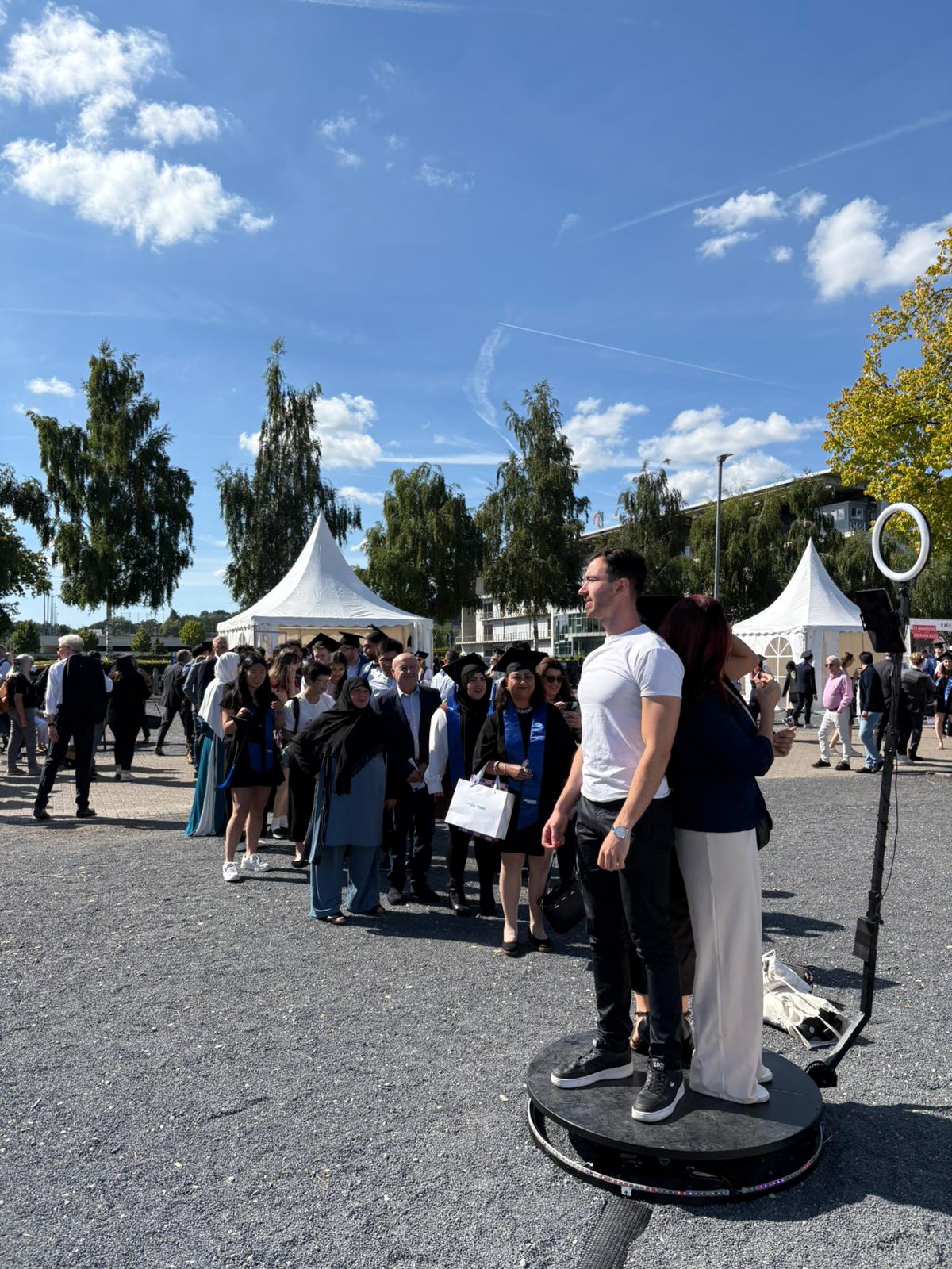 Die Spinbooth passte gut zum Rahmen eines Graduiertenfests, weil sie einen modernen, lockeren Programmpunkt liefert und gleichzeitig die Markenpräsenz von Evonik unterstützt.
