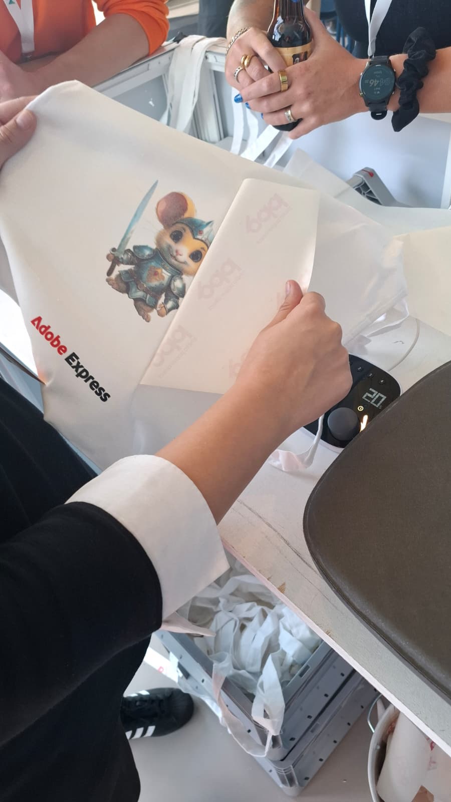 Auch die Gestaltung vor Ort war ein wichtiger Teil des Projekts: Die Theke war mit einem individuellen Stoff im Mini-Design ausgestattet, und ein Promoter betreute die gesamte Station. Er erklärte den Ablauf, half beim Transferdruck und stand jederzeit für Fragen bereit. Dadurch fühlten sich die Gäste eingebunden und erlebten den Prozess aus erster Hand.