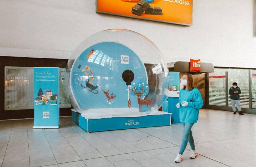 Besonders beliebt und häufig für Weihnachtsfeiern angefragt ist unsere XXL-Schneekugel. Diese hat großflächige Branding-Optionen und ist vollkommen begehbar. Drinnen nimmt eine Fotobox dann ein Foto Ihrer Mitarbeiter:innen auf, bei dem die maximale Weihnachtsstimmung aufkommt.