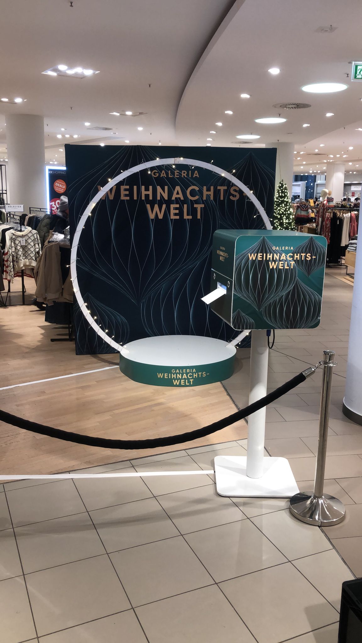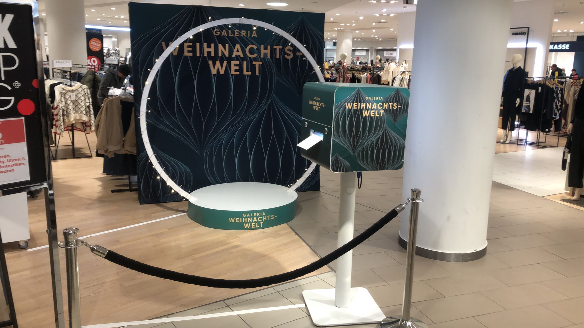 Die Weihnachtsring Photobooth Aktion wurde gemeinsam mit Kollektiv K an mehreren GALERIA Standorten umgesetzt und bot Gästen über mehrere Wochen ein stimmungsvolles Fotoerlebnis. Die Photobooths standen unbetreut in den Filialen, damit Besucher jederzeit ein winterliches Erinnerungsfoto aufnehmen konnten. Außerdem war jedes Setup fest in die GALERIA Weihnachtswelt integriert und fügte sich dadurch harmonisch in die Gestaltung ein.