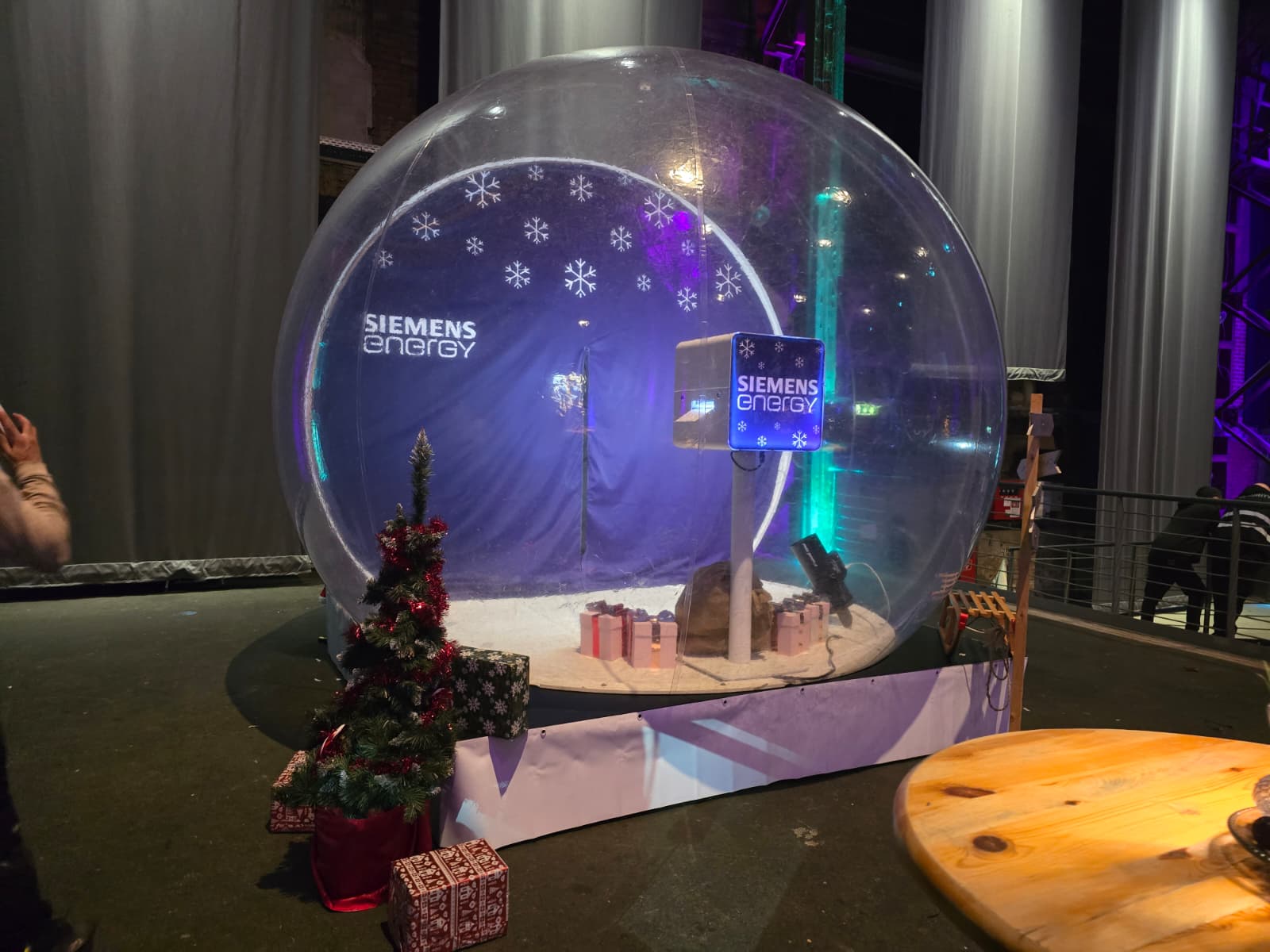 Bei dieser Weihnachtsfeier von Siemens stand eine klare Idee im Mittelpunkt, denn die Gäste sollten ein winterliches Erlebnis erhalten, das emotional wirkt und gleichzeitig aktiv einbindet. In der Kraftzentrale Duisburg entstand dafür eine Aktionsfläche, die bewusst auf Interaktion setzte und so schnell zum Treffpunkt der Veranstaltung wurde. Die Kombination aus XXL Schneekugel, Photobooths und einem analogen Mosaik sorgte für Abwechslung, aber auch für eine gleichmäßige Auslastung aller Stationen.